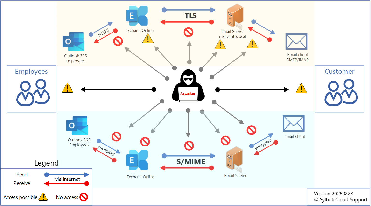 Sehen Sie sich die beiden folgenden Bilder an, um die Unterschiede zwischen TLS, MPME und S/MIME zu erkennen. Klicken Sie auf die Schaltflächen unten, um die Bilder zu wechseln.