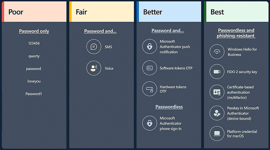In Microsoft 365, biometric authenticatio (fingerprint or facial recognition) via Windows Hello for Business is considered the gold standard for modern security. This protects your account by replacing a password with a unique cryptographic devicebound method. See the other best options besides Windows Hello for business in Image 1.